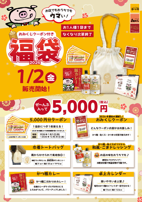 税込5,000円で、5,000円分の福袋クーポンや何が入っているかお楽しみのおみくじクーポン、お店の味をお家で楽しめる商品、使いやすいオリジナルグッズなど、盛りだくさんの内容です!