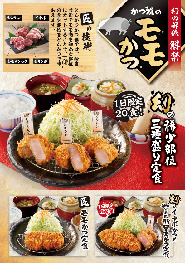 モモ肉は、赤身が多く脂身が少なくヘルシーで、あっさりとした味わいです。 とんかつかつ雅では、独自の技術でモモ肉をさらに細かな部位にカットすることで、「幻」の希少部位をとんかつで味わえます。